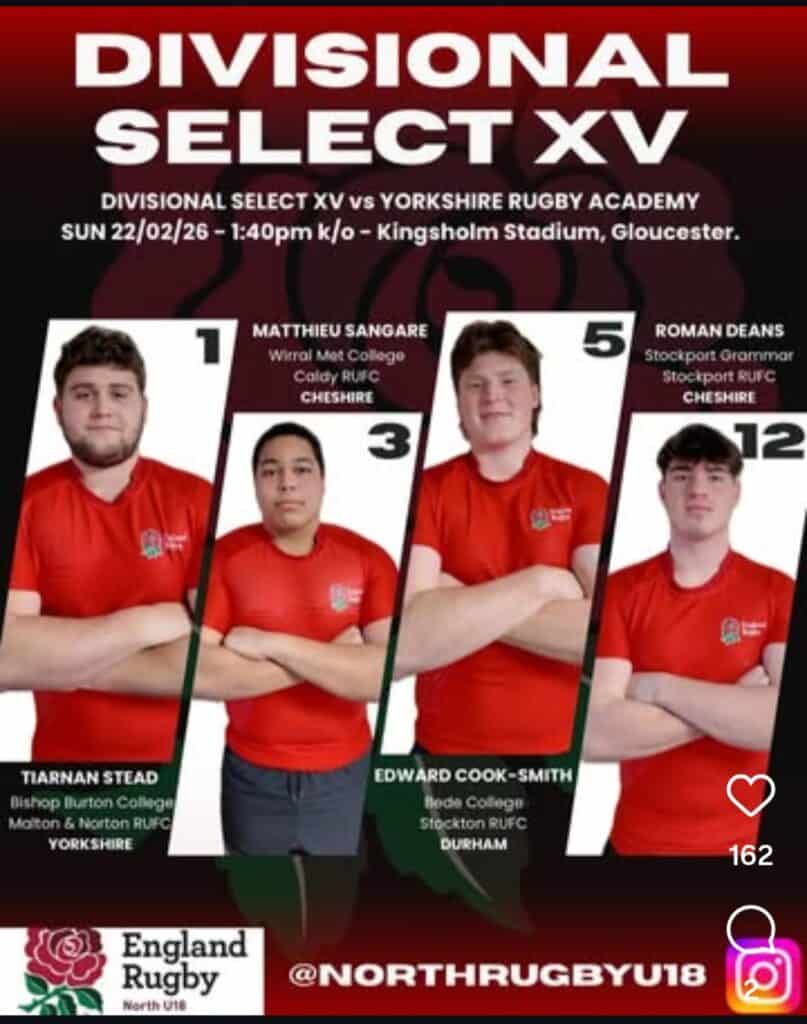 Following the recent North of England U18 weekend, Congratulations to Matthieu Sangare (Wirral Met College/Caldy RFC & Roman Deans(Stockport GS and Stockport RFC on their selection for the England U18 Divisional XV.
